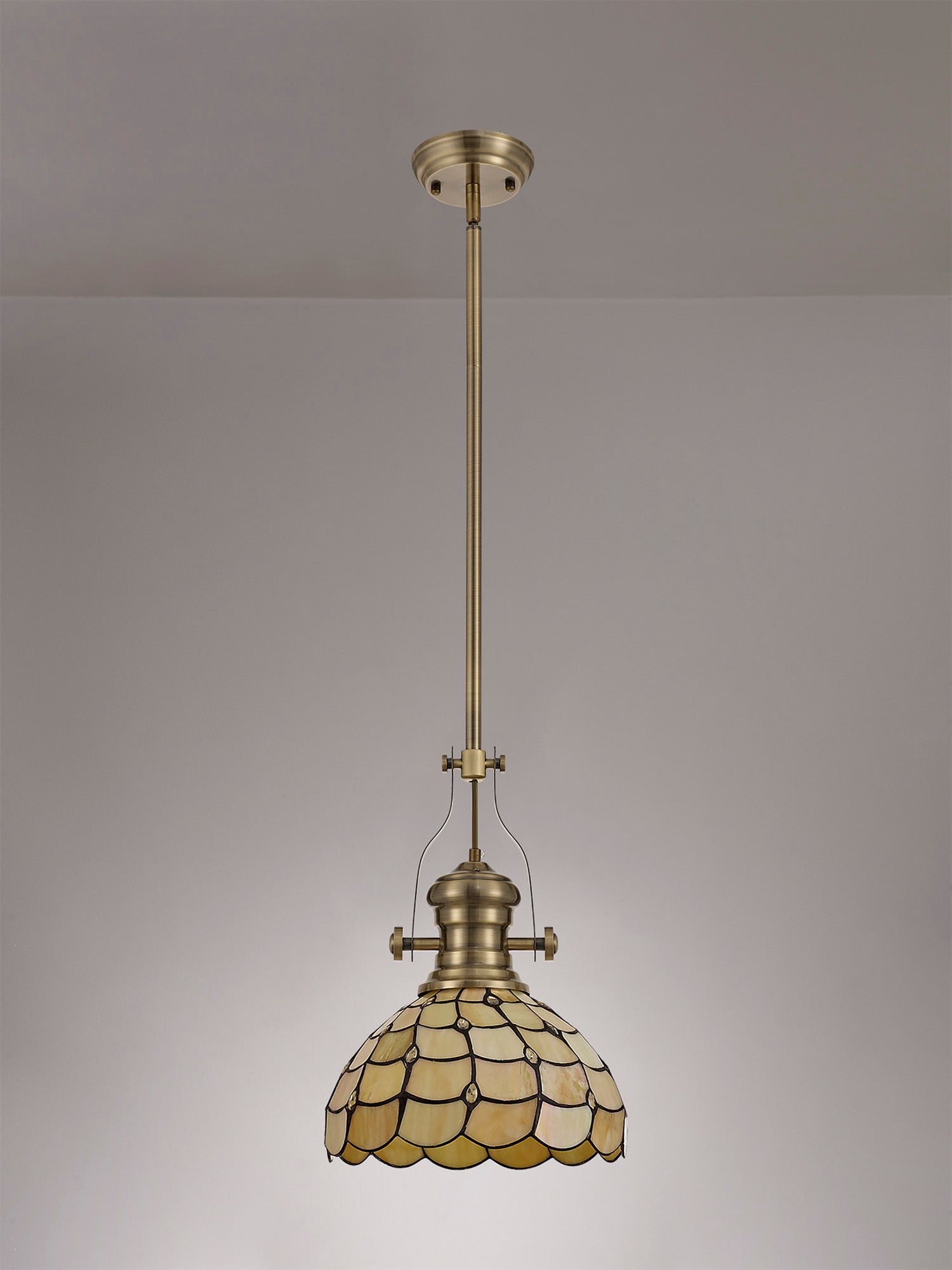 Finney 1 Light Pendant E27 With 30cm Tiffany Shade, Antique Brass/Beige/Clear Crystal