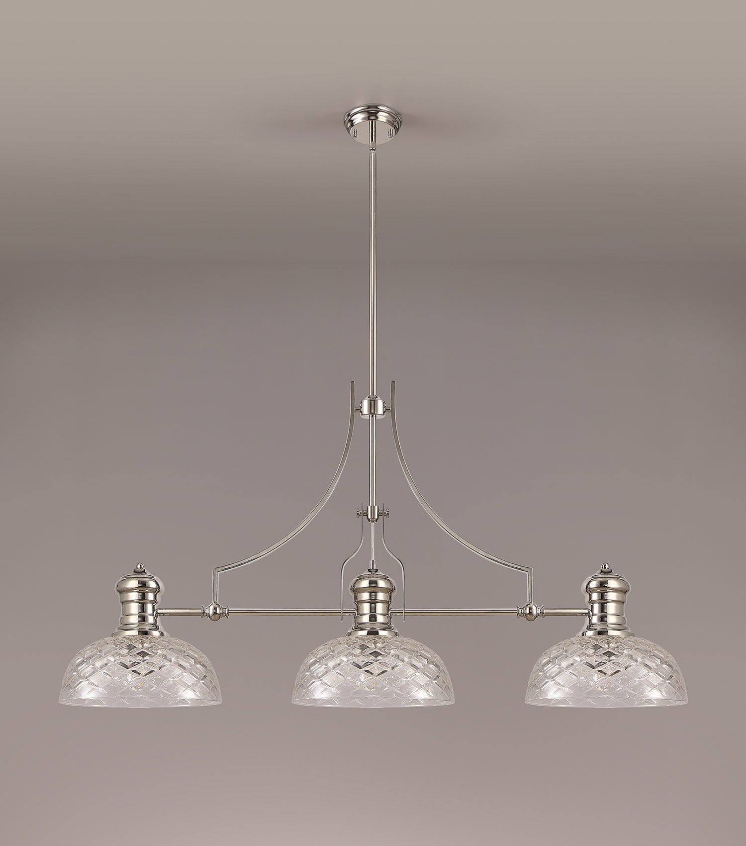 Munro Linear Pendant With 30cm Flat Round Patterned Shade, 3 x E27, Polished Nickel/Clear Glass