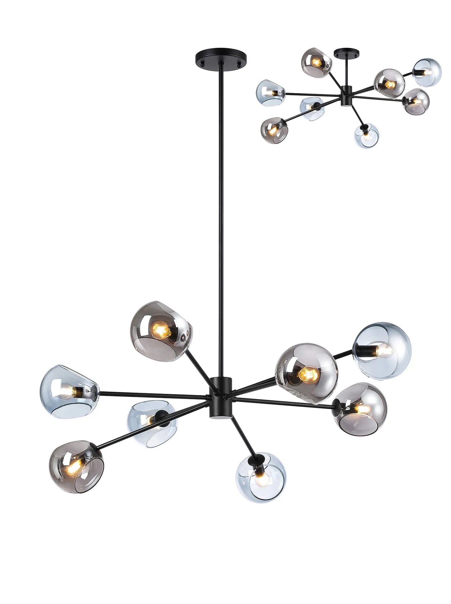 Peters 100cm Round Fixed Pendant With Double Cut Glass, 8 x E14, Satin Black/Blue/Smoke