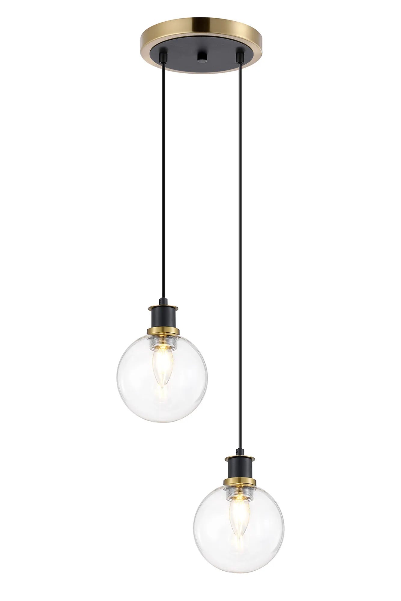 Stevens 2 Light Pendant, E14 With 15cm Round Glass Shades, Brass, Clear & Satin Black is backordered and will ship as soon as it is back in stock.