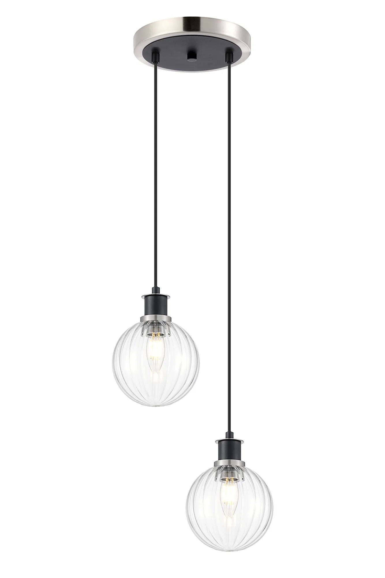 Stevens 2 Light Pendant, E14 With 15cm Round Segment Glass Shades, Satin Nickel, Clear & Satin Black is backordered and will ship as soon as it is back in stock.