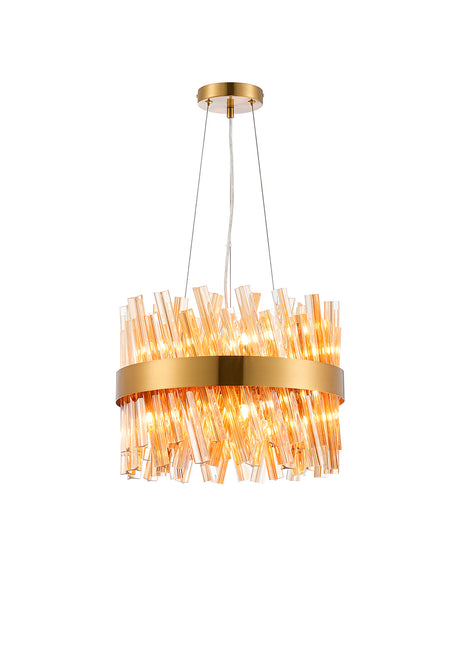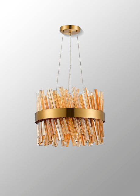 £498.33 + VAT (£598.00)Unit price /UnavailableVery low stock (3 units)Melville 60cm 18 Light G9, Pendant Round, Brass / Amber Item Weight: 16.81kg