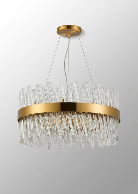 £525.00 + VAT (£630.00)Unit price /UnavailableVery low stock (3 units)Melville 60cm 18 Light G9, Pendant Round, Brass / Clear Item Weight: 16.81kg