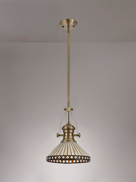 Wearne 1 Light Pendant E27 With 30cm Tiffany Shade, Antique Brass/Amber/Cream/Crystal