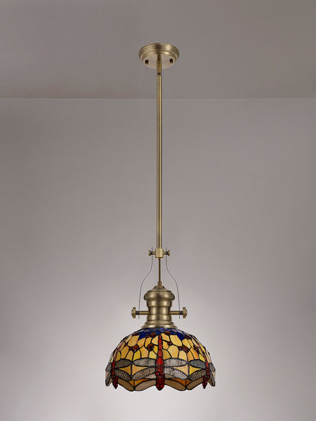 £171.67 + VAT (£206.00)Unit price /UnavailableVery low stock (2 units)Hinnigan 1 Light Pendant E27 With 30cm Tiffany Shade, Antique Brass/Blue/Orange/Crystal