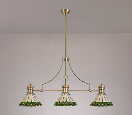 Williams 3 Light Linear Pendant E27 With 30cm Tiffany Shade, Antique Brass, Green, Cream, Crystal