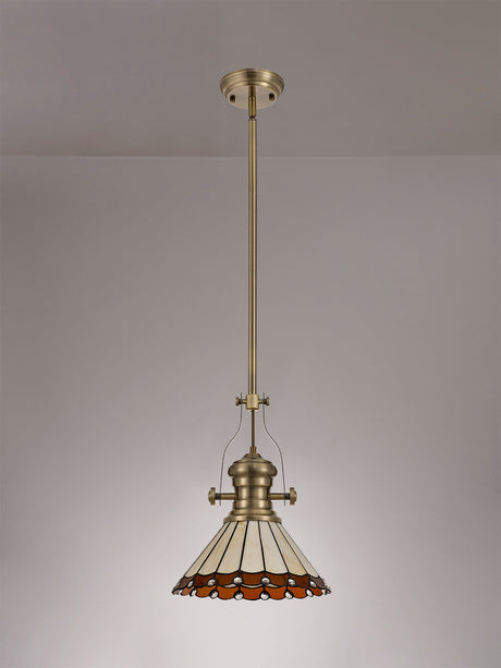 Williams 1 Light Pendant E27 With 30cm Tiffany Shade, Antique Brass/Green/Cream/Crystal