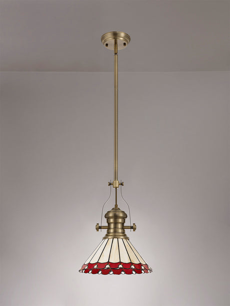 Williams 1 Light Pendant E27 With 30cm Tiffany Shade, Antique Brass/Red/Cream/Crystal