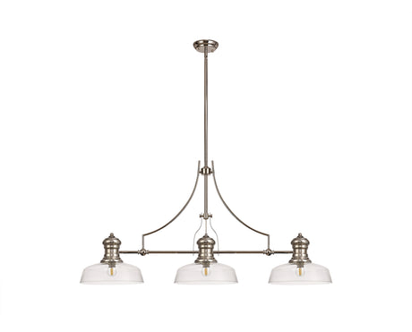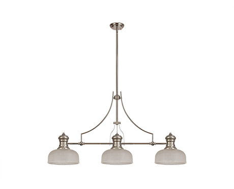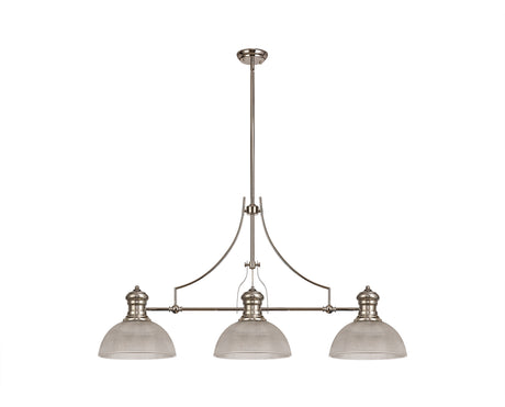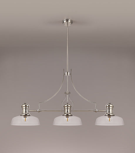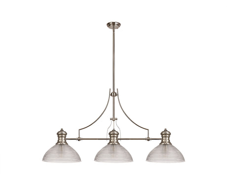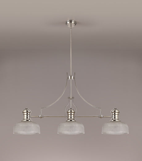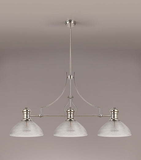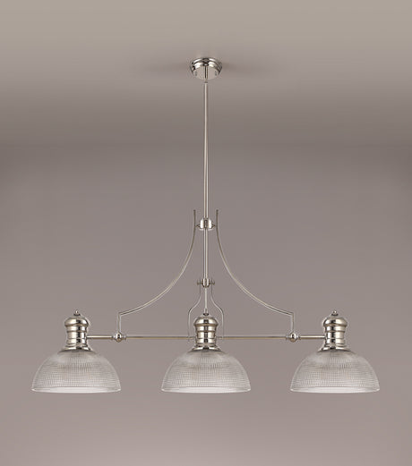 £353.33 + VAT (£424.00)Unit price /UnavailableLow stock (16 units)Munro 3 Light Linear Pendant E27 With 26.5cm Prismatic Glass Shade, Polished Nickel, Clear