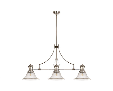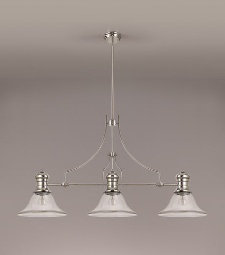 £293.33 + VAT (£352.00)Unit price /UnavailableVery low stock (7 units)Munro 3 Light Linear Pendant E27 With 30cm Smooth Bell Glass Shade, Polished Nickel, Clear