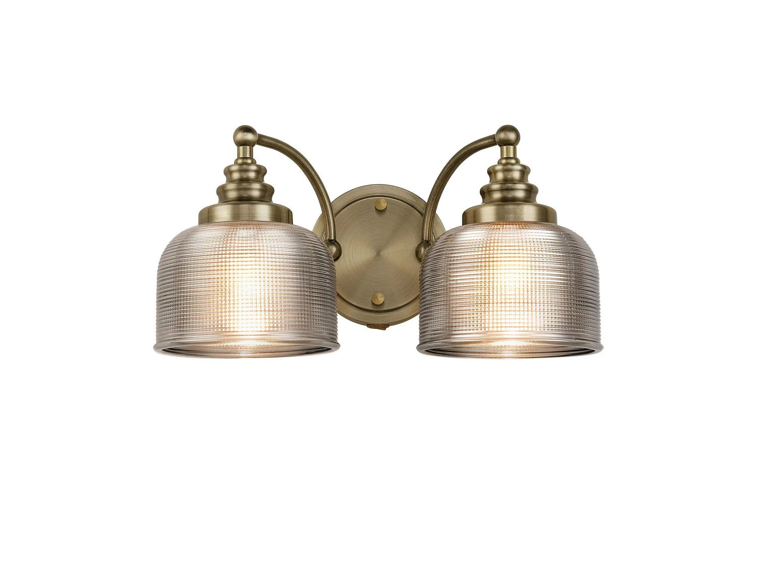 Gray Switched Double Wall Light, 2 Light E27 Antique Brass/Smoke Glass
