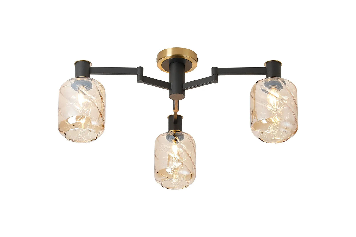 Adamson Swing Arm Flush Ceiling 3 x E14 Brass/Satin Black/Amber Twisted Cylinder Glass