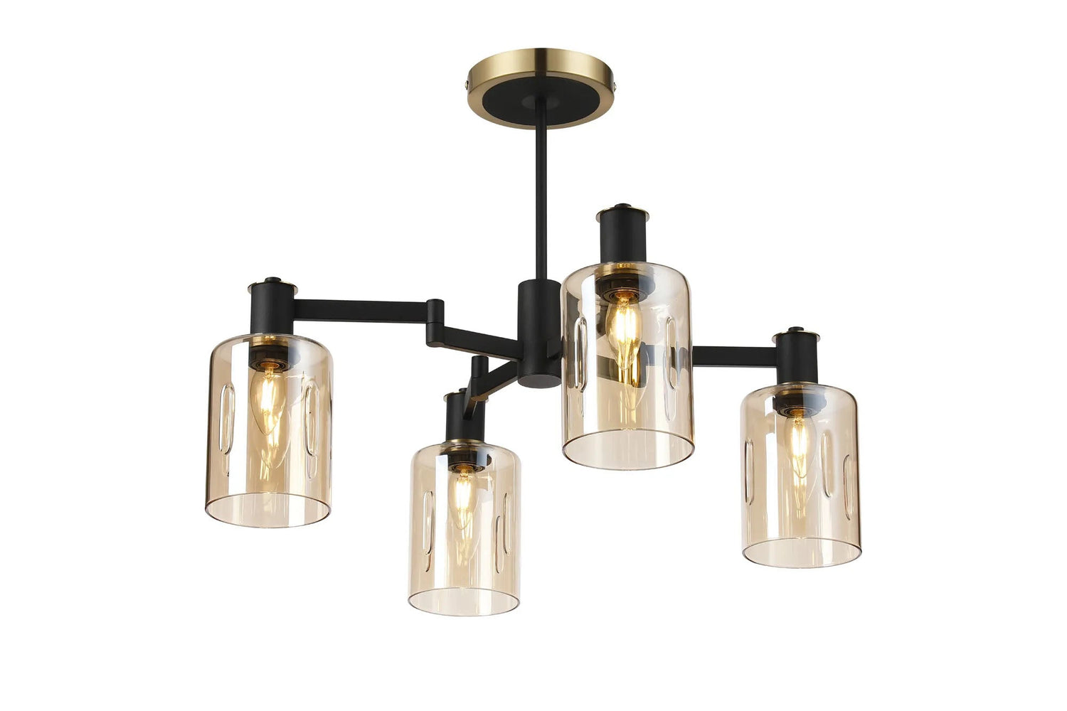 Adamson Swing Arm Semi Ceiling 4 x E14 Brass/Satin Black/Amber Uniform Dimple Cylinder Glass
