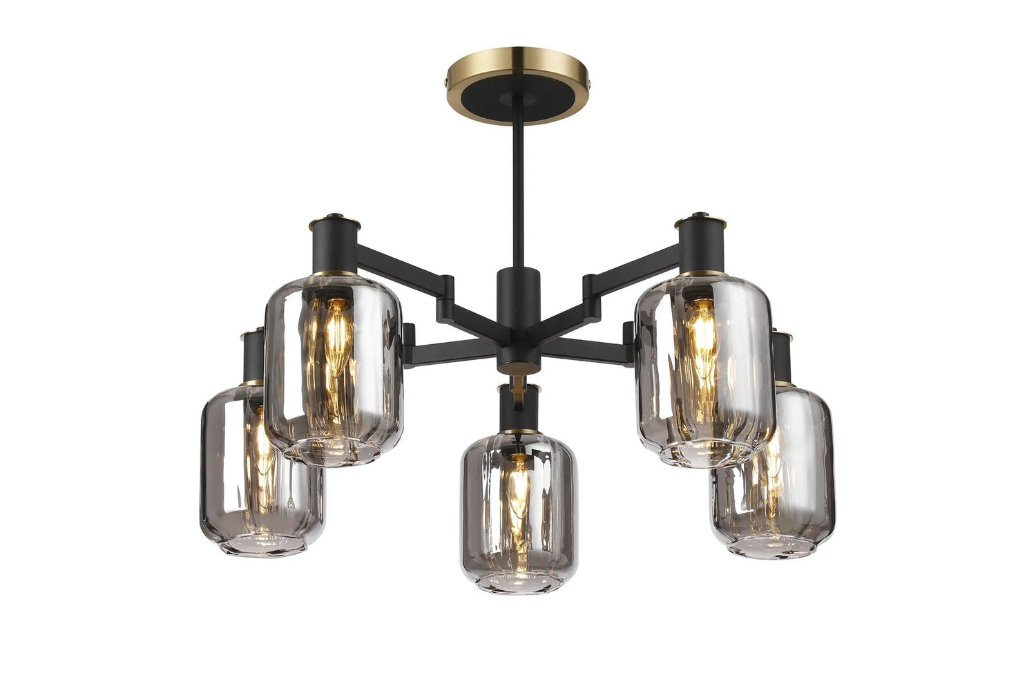 Adamson Swing Arm Semi Ceiling 5 x E14 Brass/Satin Black/Smoke Striped Cylinder Glass