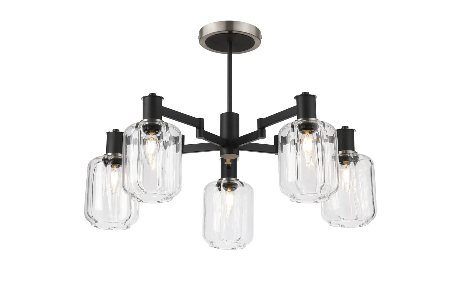 Adamson Swing Arm Semi Ceiling 5 x E14 Satin Nickel/Satin Black/Clear Striped Cylinder Glass is backordered and will ship as soon as it is back in stock.