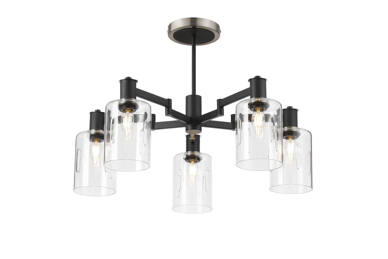 Adamson Swing Arm Semi Ceiling 5 x E14 Satin Nickel/Satin Black/Clear Uniform Dimple Cylinder Glass
