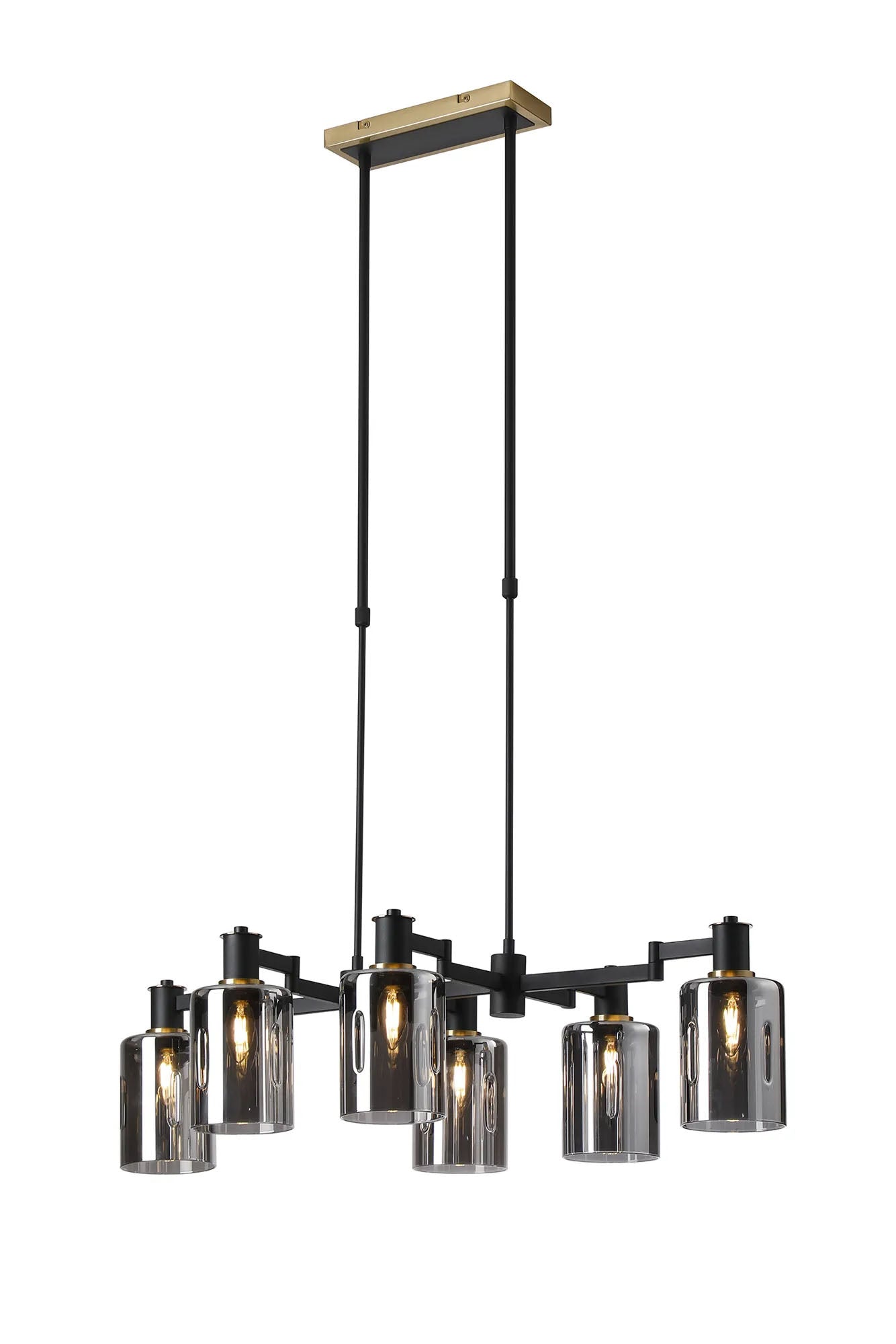 Adamson Swing Arm Telescopic Linear Pendant 6 x E14 Brass/Satin Black/Smoke Uniform Dimple Cylinder Glass