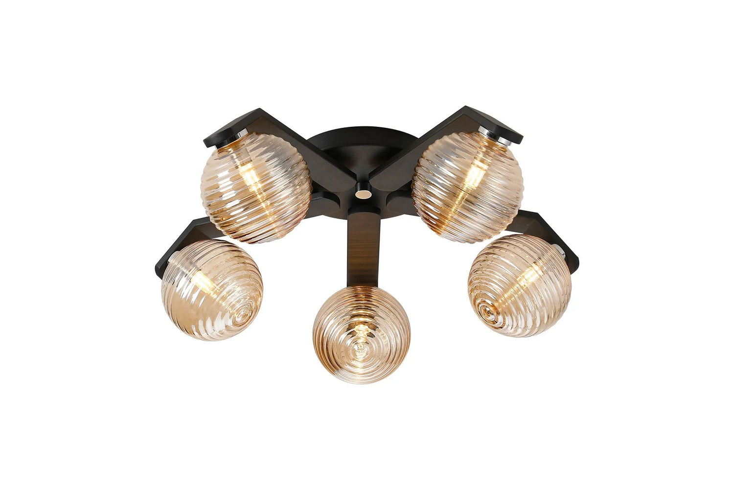 Bellingham Flush Ceiling, 5 x G9, IP44, Black/Polished Chrome/Amber Ribbed Round Glass
