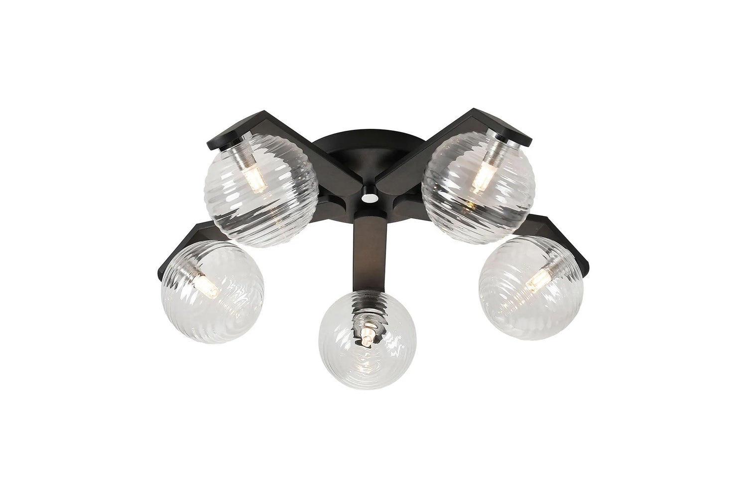 Bellingham Flush Ceiling, 5 x G9, IP44, Black/Polished Chrome/Clear Ribbed Round Glass