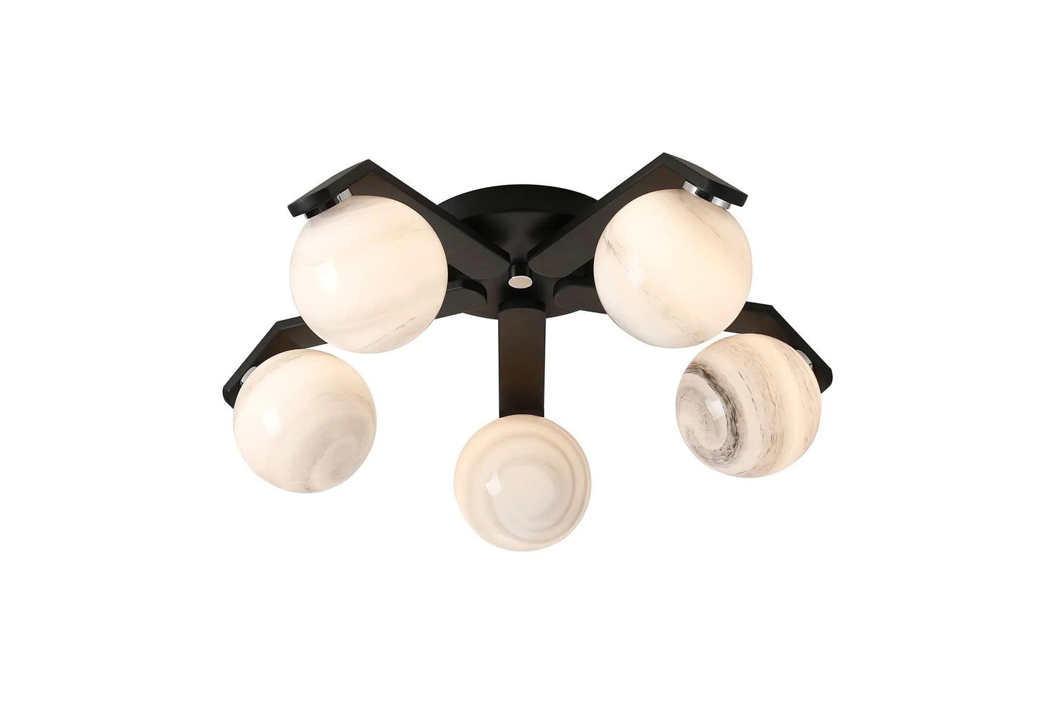 Bellingham Flush Ceiling, 5 x G9, IP44, Black/Polished Chrome/Grey Round Marble Effect Glass