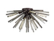 The Harris collection presents an intriguing glass shape moulded into a three dimensional triquetra. The grooves along each sized glass create an appealing optical effect which is effortlessly enhanced with the use of tubular lamps. The wide variety of fixtures available in this range span from a 6 light semi flush to an impacting 32 light pendant. The complementing wall lamps available allow for further application built around the same lighting family. Each frame can be chosen with either a brown oxide, polished nickel or matt black frame with either clear, champagne gold or smoke glass.