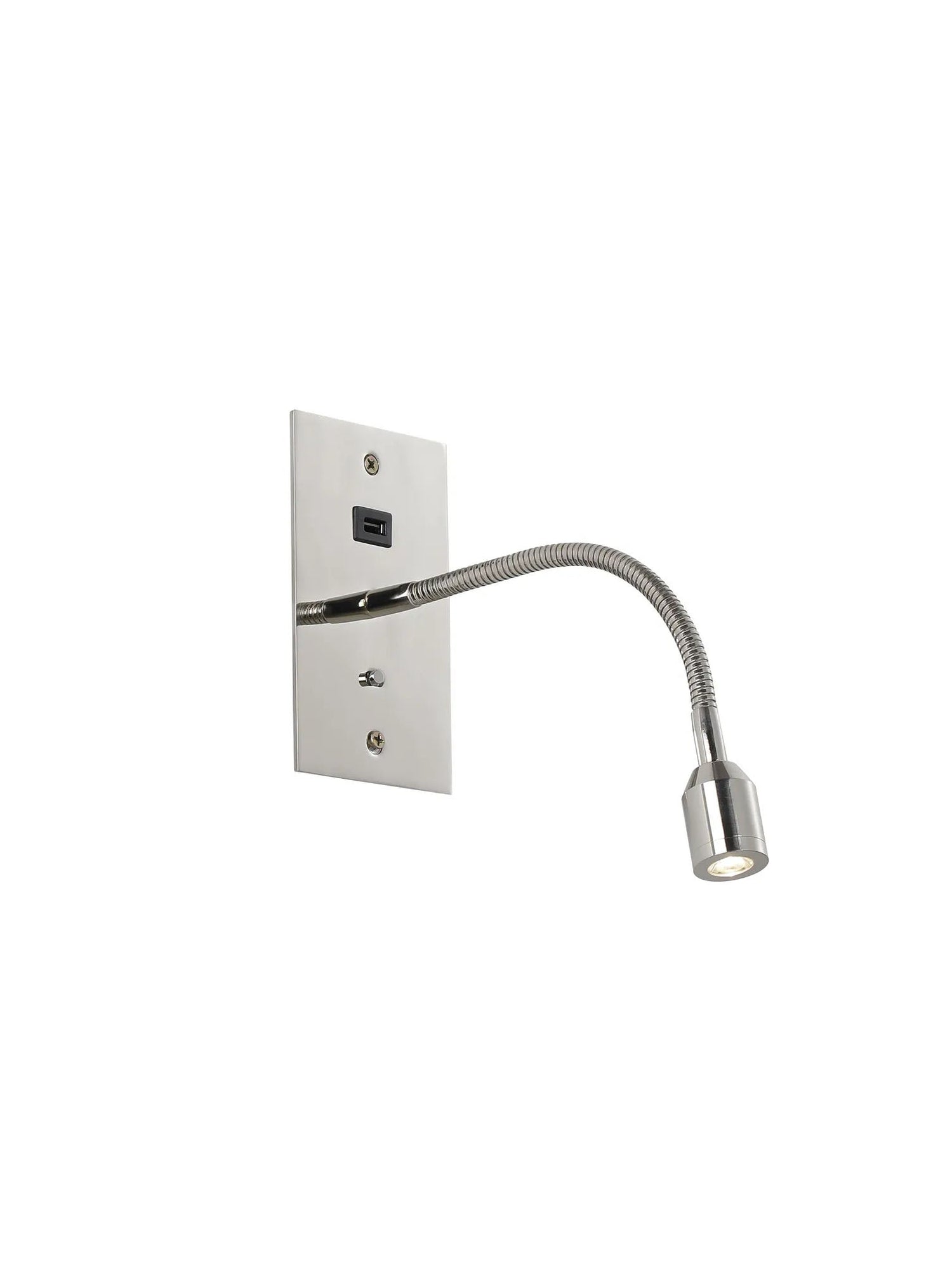 Mullery USB Wall Lamp, 1 Light Adjustable Switched Fits A Standard Double Socket Box, 3W LED, 3000K, Polished Nickel