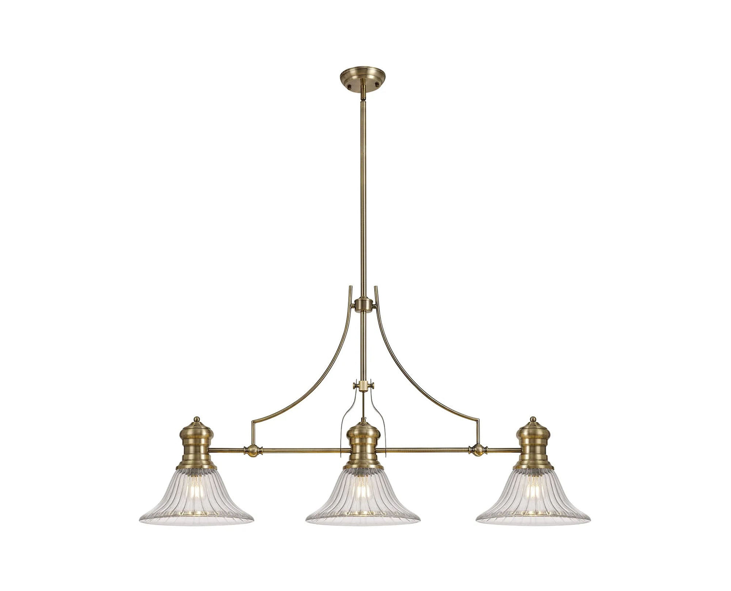 Munro 3 Light Linear Multi Height Pendant E27 With 30cm Bell Glass Shade, Antique Brass, Clear