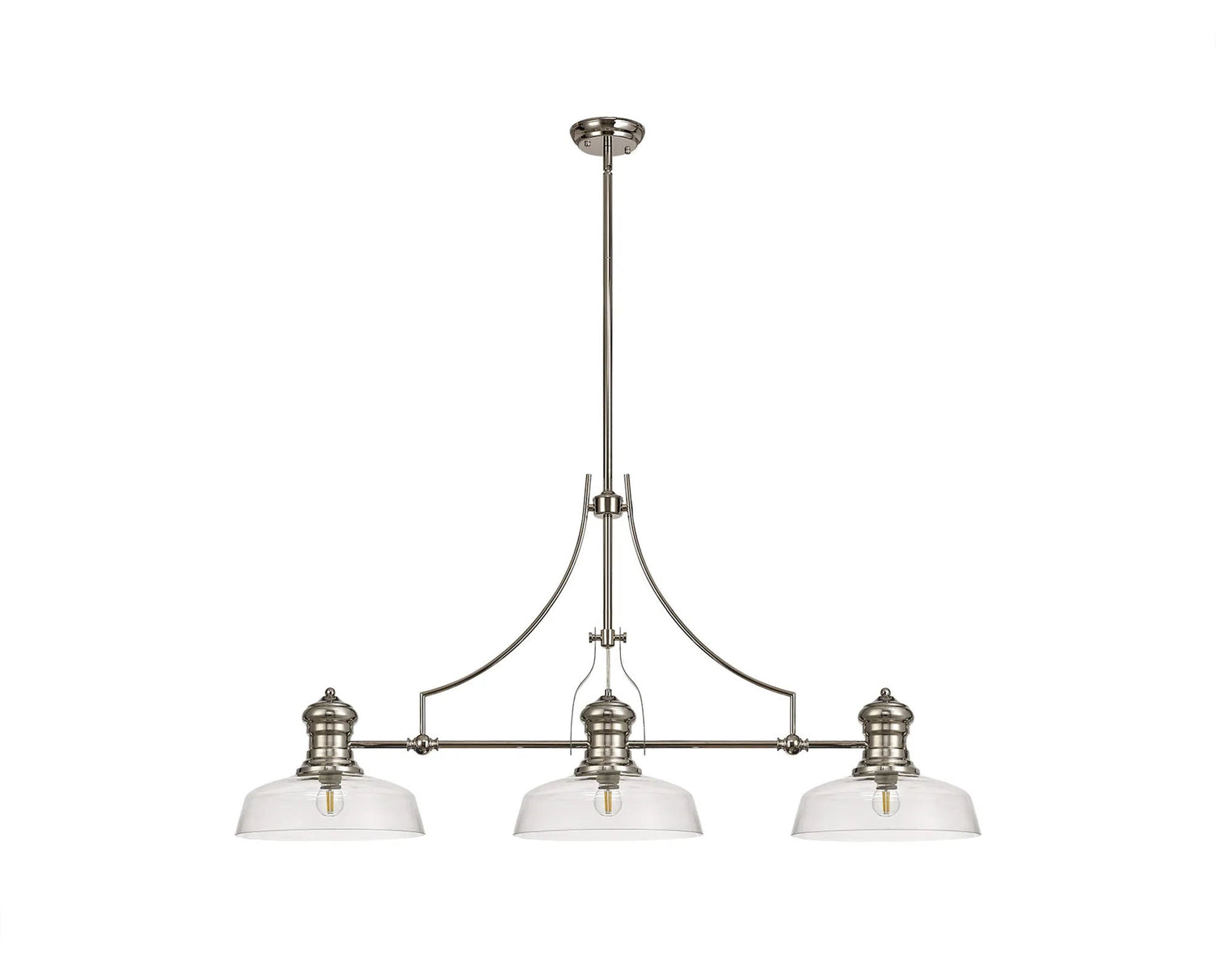 Munro 3 Light Linear Multi Height Pendant E27 With 30cm Flat Round Glass Shade, Polished Nickel, Clear
