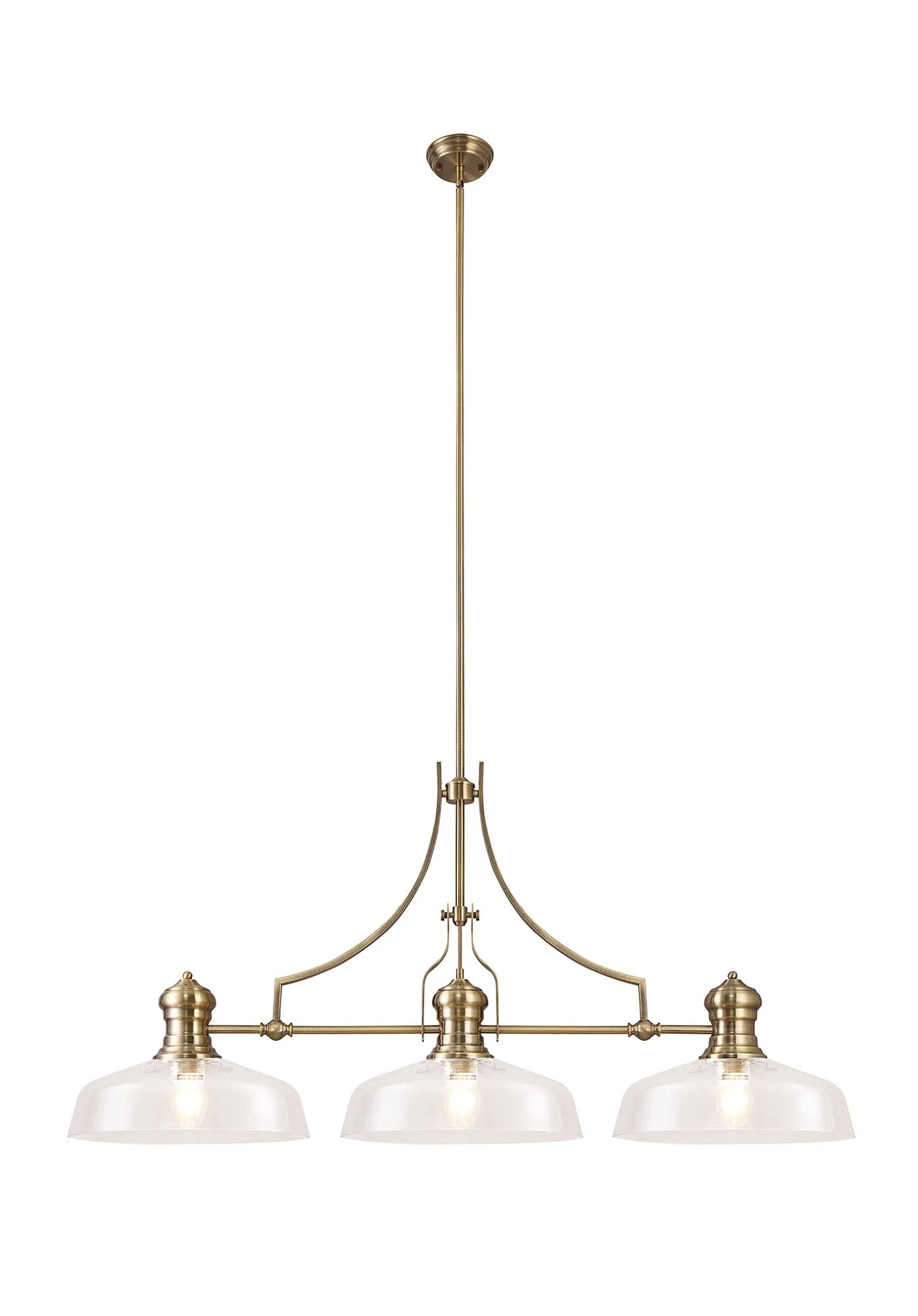 Munro Linear Multi Height Pendant With 38cm Flat Round Shade, 3 x E27, Antique Brass/Clear Glass