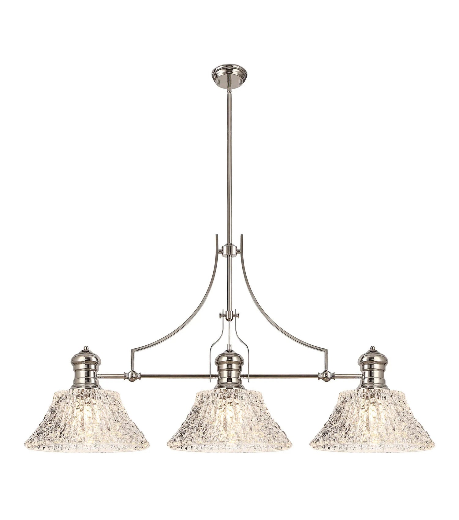 Munro Linear Multi Height Pendant With 38cm Patterned Round Shade, 3 x E27, Polished Nickel/Clear Glass (19.1kg)