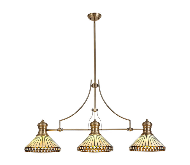 Wearne 3 Light Linear Pendant E27 With 30cm Tiffany Shade, Antique Brass, Amber, Cream, Crystal