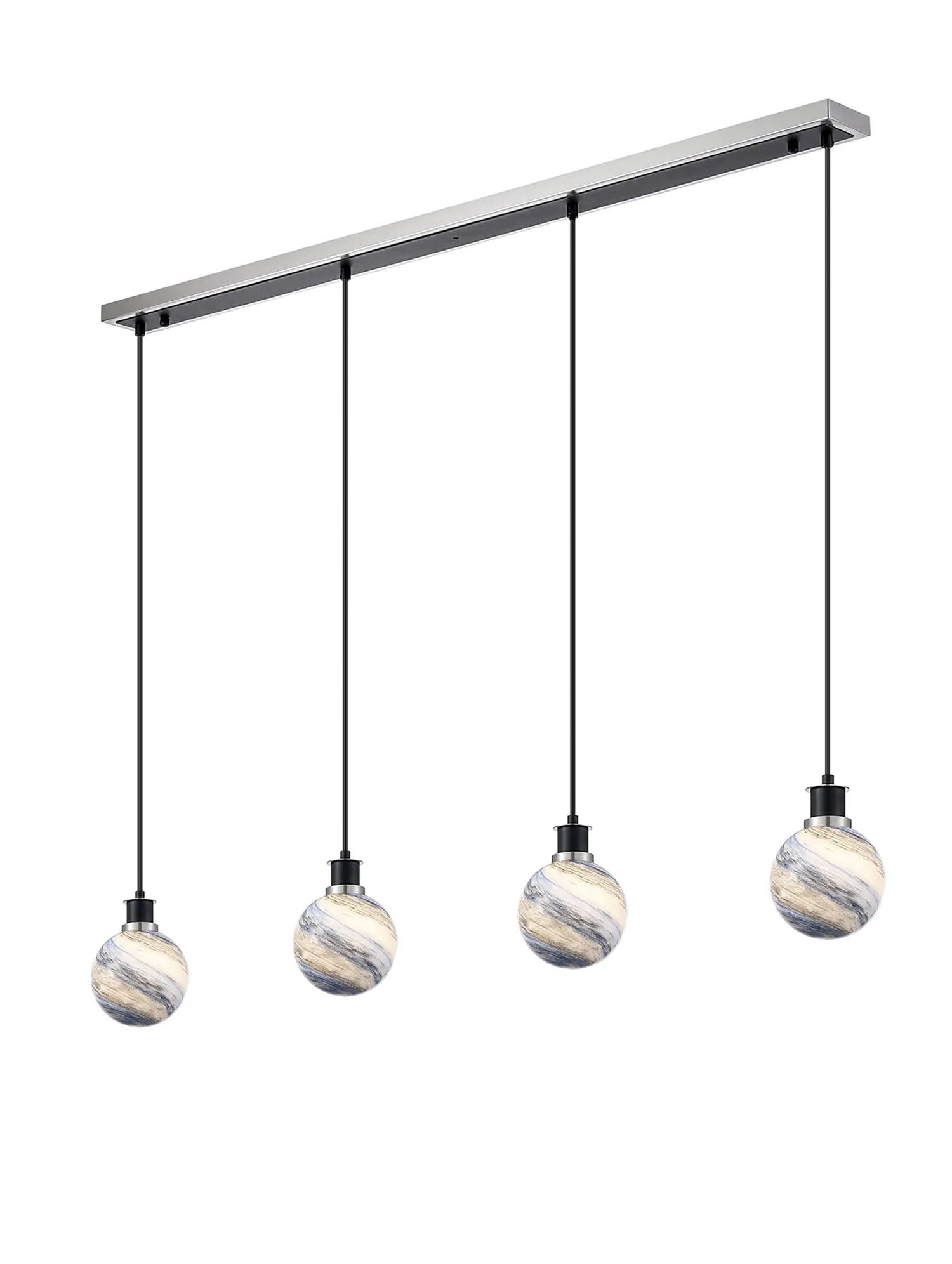 Stevens 1.3m Linear Pendant, 4 Light E14 With 15cm Round Dark Blue Marble Effect Glass Shade, Satin Nickel & Satin Black Framework