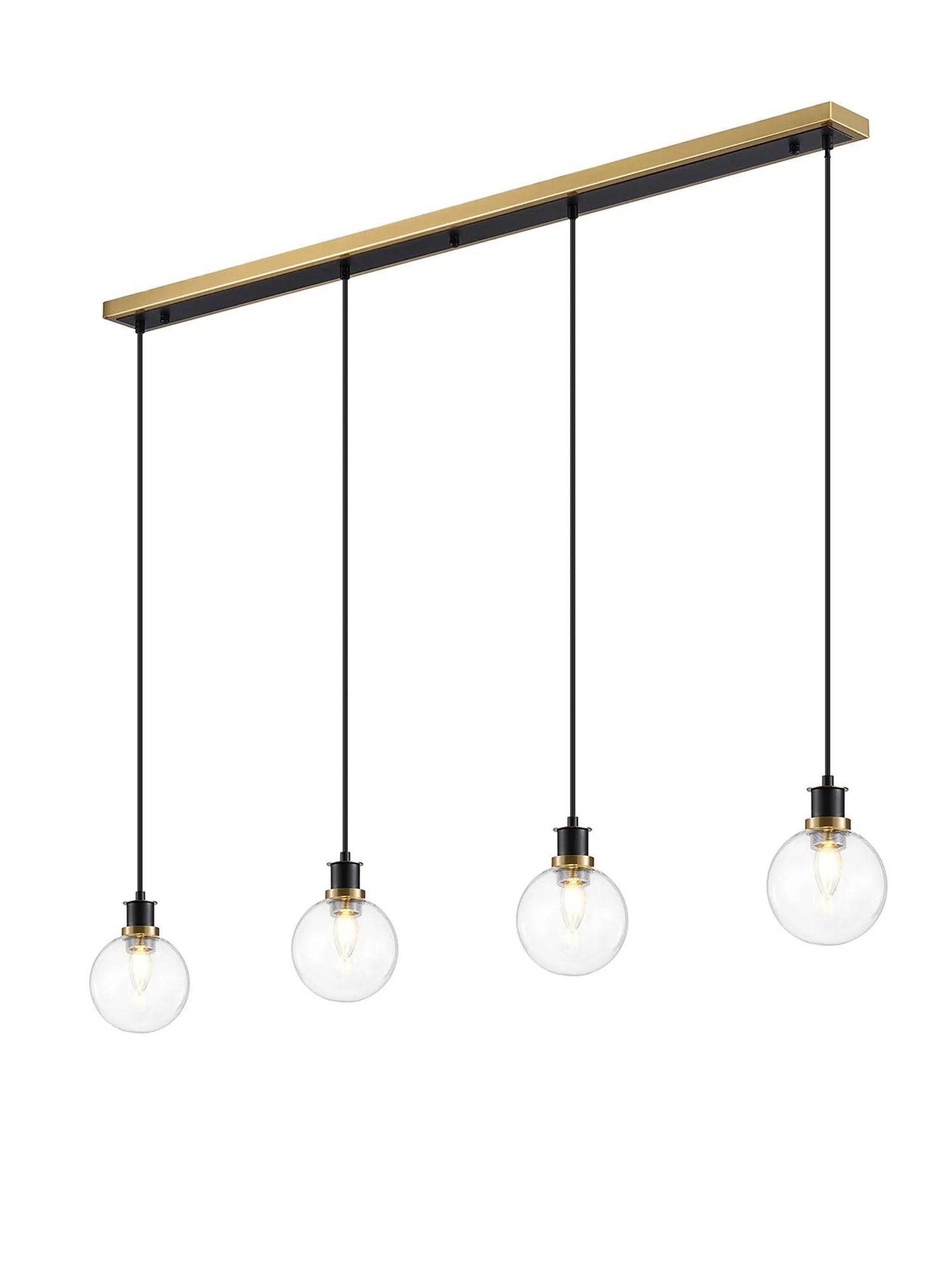 Stevens 1.3m Linear Pendant, 4 x E14 With 15cm Round Glass Shade, Brass, Clear & Satin Black