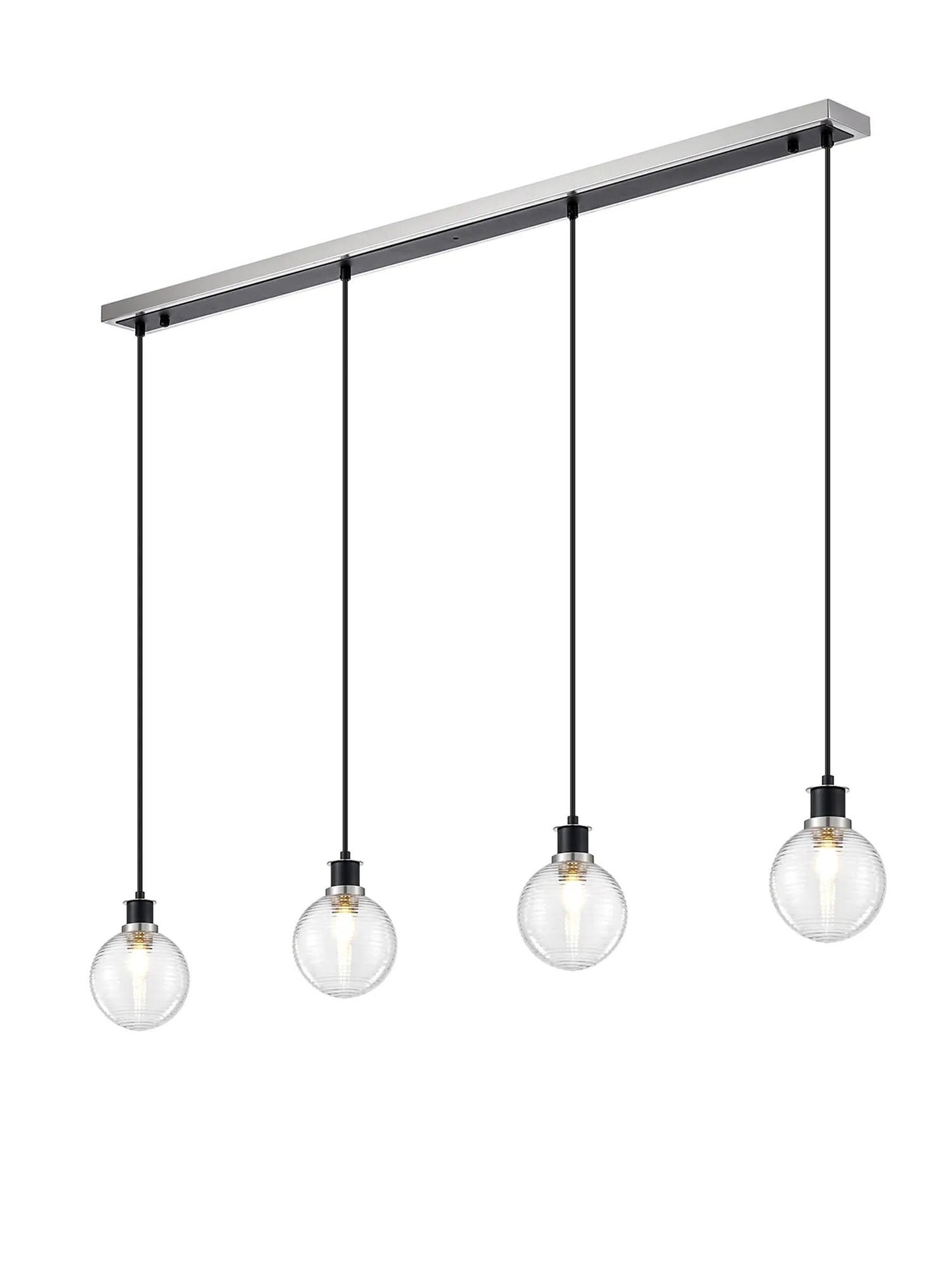 Stevens 1.3m Linear Pendant, 4 x E14 With 15cm Round Ribbed Glass Shade, Satin Nickel, Clear & Satin Black