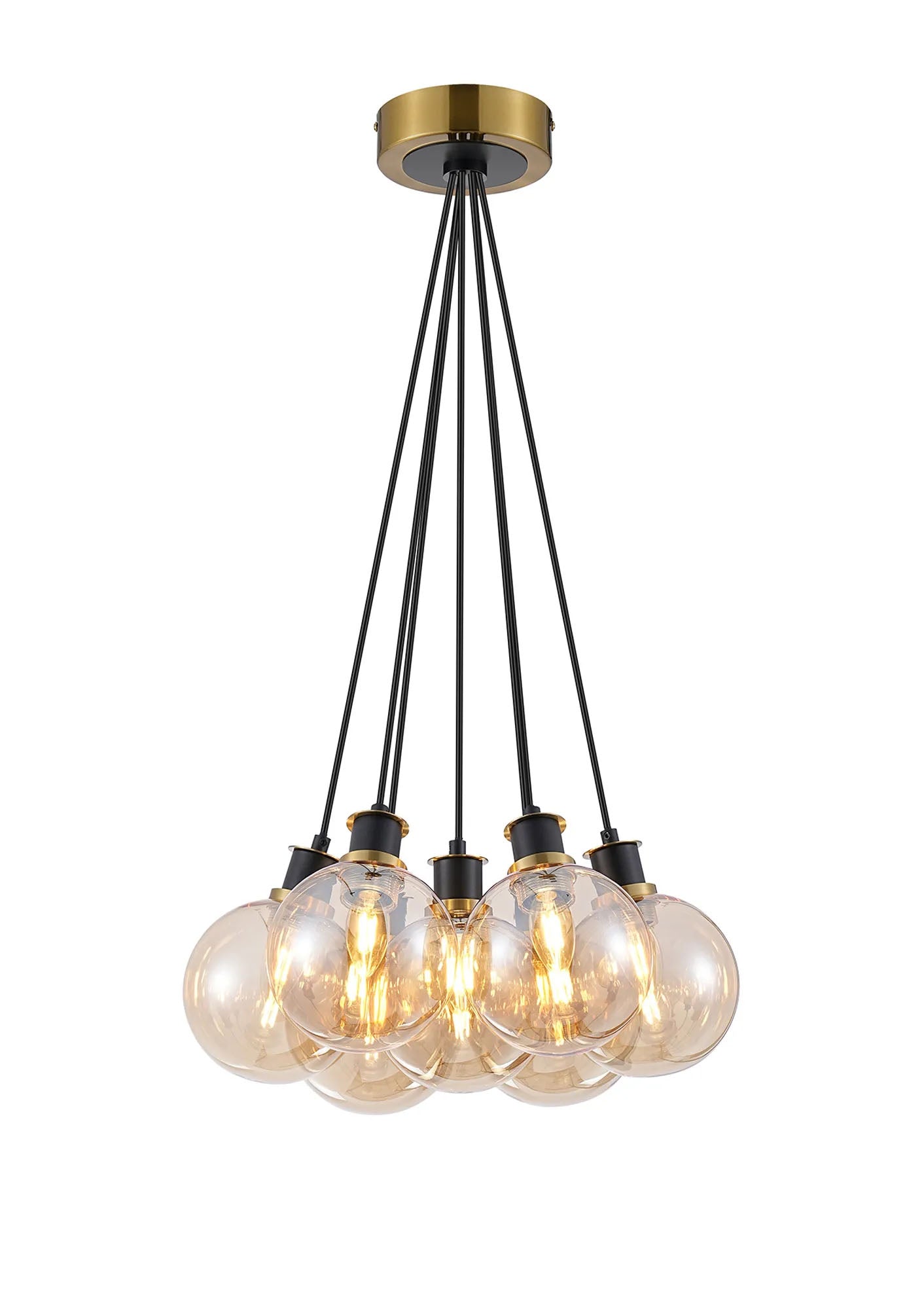 Stevens 1.3m Round Cluster Pendant, 7 x E14 With 15cm Round Glass Shade, Brass, Amber Plated & Satin Black is backordered and will ship as soon as it is back in stock.