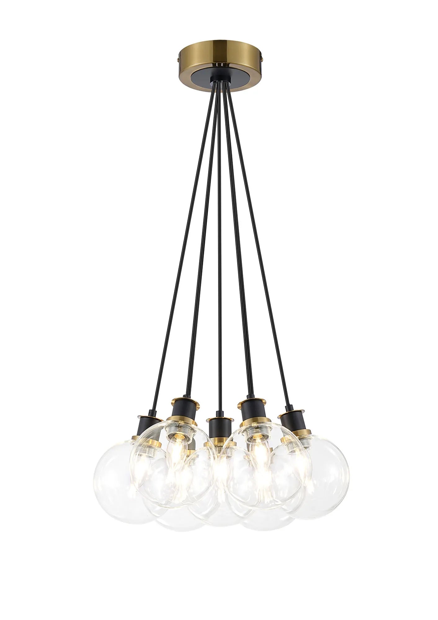 Stevens 1.3m Round Cluster Pendant, 7 x E14 With 15cm Round Glass Shade, Brass, Clear & Satin Black is backordered and will ship as soon as it is back in stock.