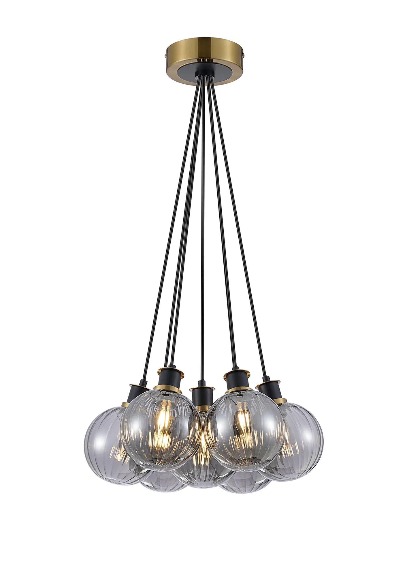 Stevens 1.3m Round Cluster Pendant, 7 x E14 With 15cm Round Segment Glass Shade, Brass, Smoke Plated & Satin Black
