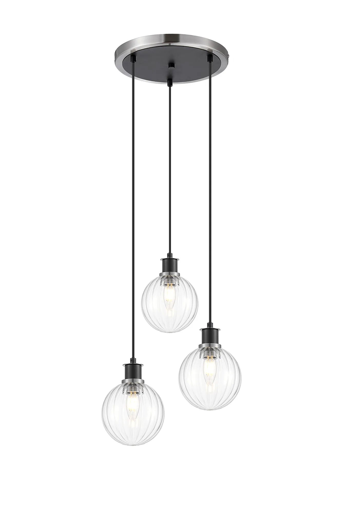 Stevens 1.3m Round Pendant, 3 x E14 With 15cm Round Segment Glass Shade, Satin Nickel, Clear & Satin Black
