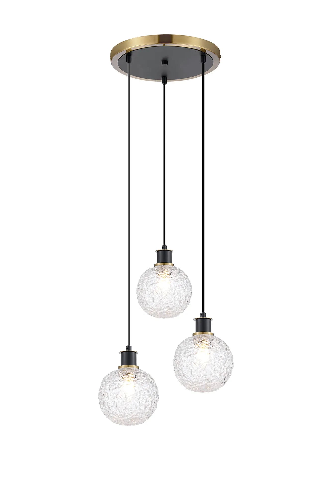 Stevens 1.3m Round Pendant, 3 x E14 With 15cm Round Textured Crumple Glass Shade, Brass, Clear & Satin Black