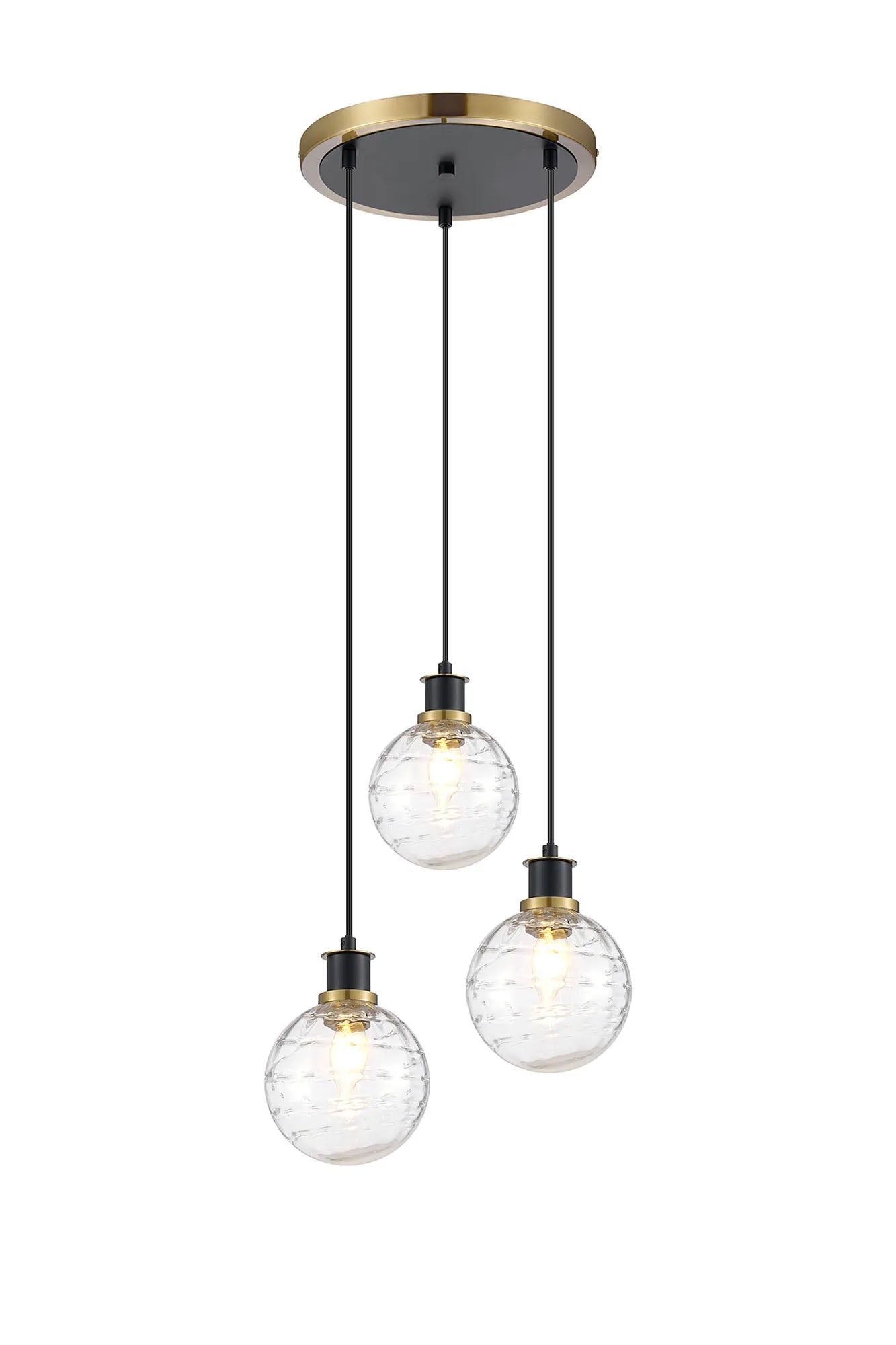 Stevens 1.3m Round Pendant, 3 x E14 With 15cm Round Textured Melting Glass Shade, Brass, Clear & Satin Black