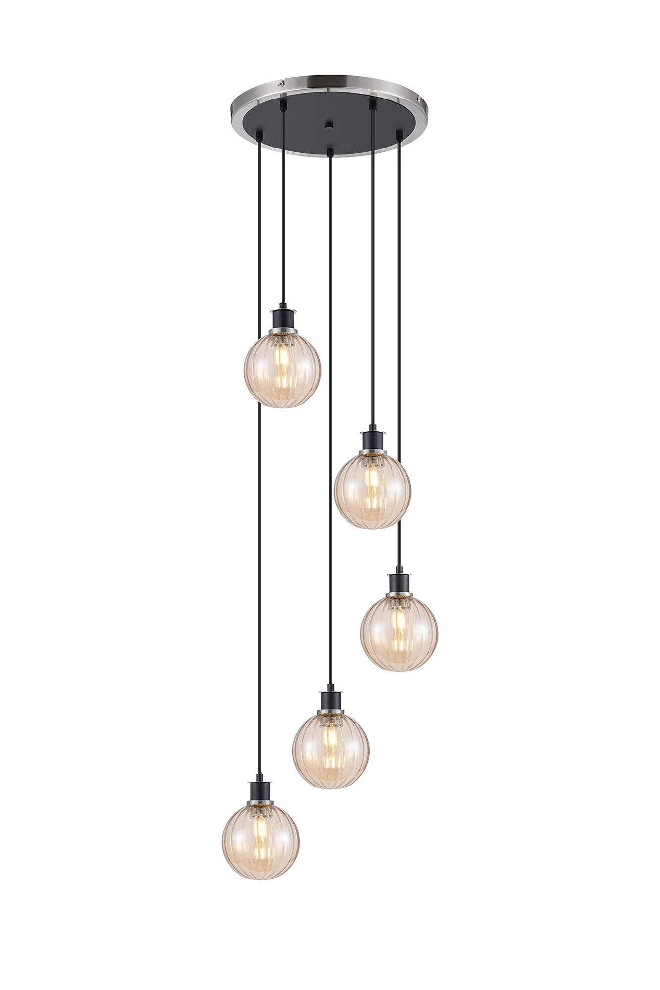 Stevens 1.8m Round Pendant, 5 x E14 With 15cm Round Segment Glass Shade, Satin Nickel, Amber Plated & Satin Black