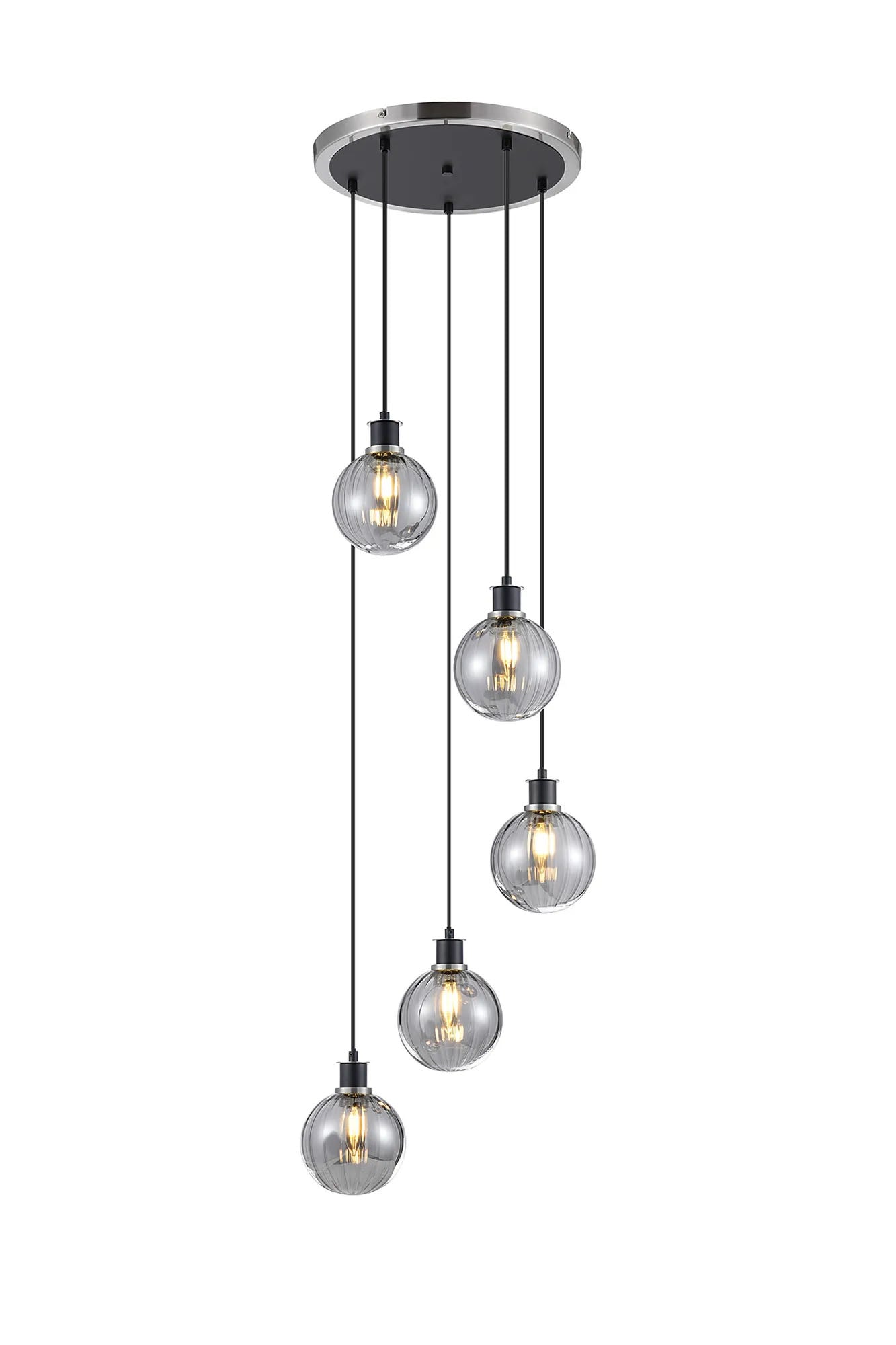 Stevens 1.8m Round Pendant, 5 x E14 With 15cm Round Segment Glass Shade, Satin Nickel, Smoke Plated & Satin Black