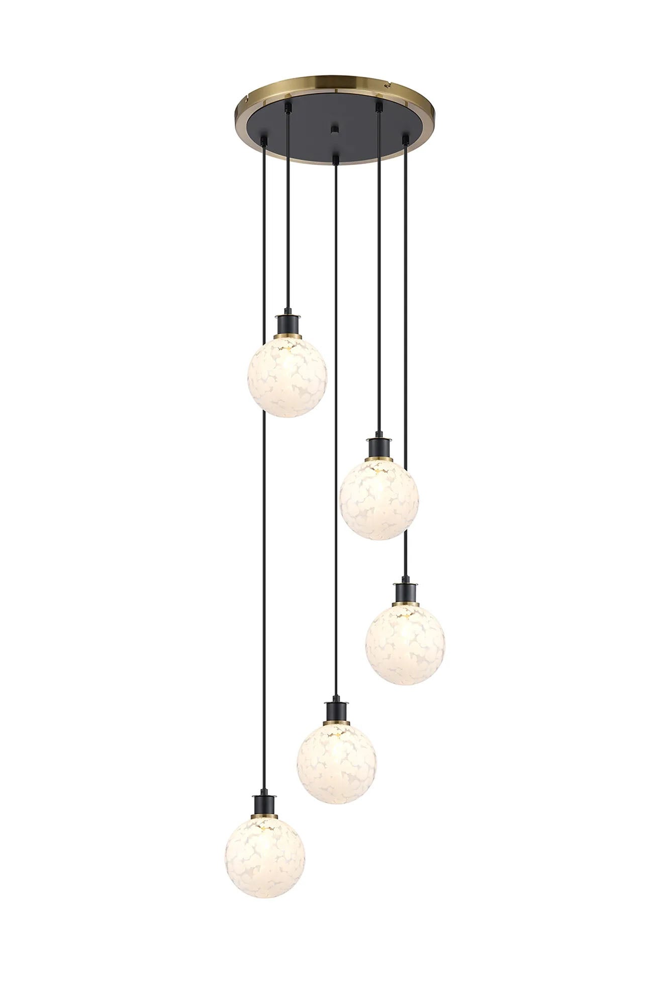 Stevens 1.8m Round Pendant, 5 x E14 With 15cm Round Speckled Glass Shade, Brass, White & Satin Black