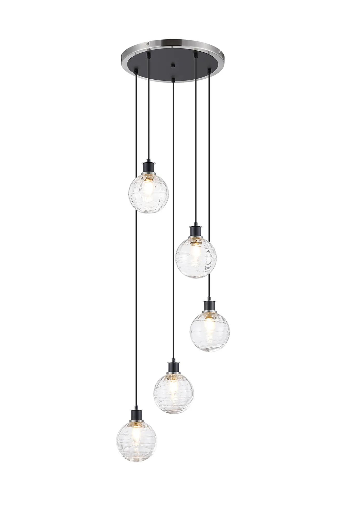 Stevens 1.8m Round Pendant, 5 x E14 With 15cm Round Textured Melting Glass Shade, Satin Nickel, Clear & Satin Black