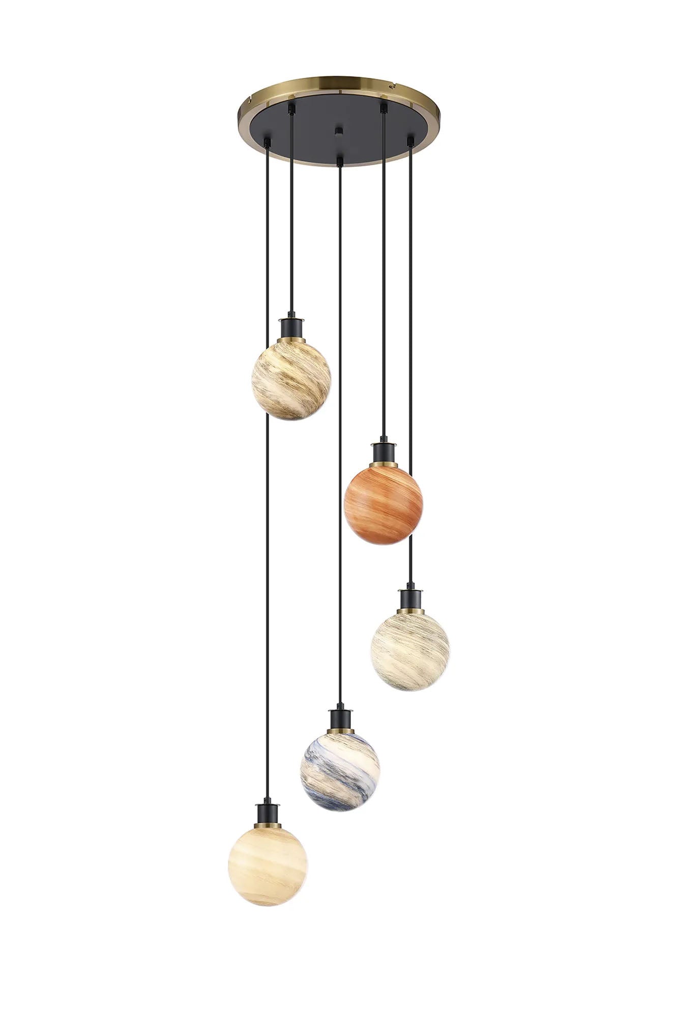 Stevens 48cm Round Pendant, 5 Light E14 With 15cm Mixed Colour Round Marble Effect Glass Shade, Brass & Satin Black Framework