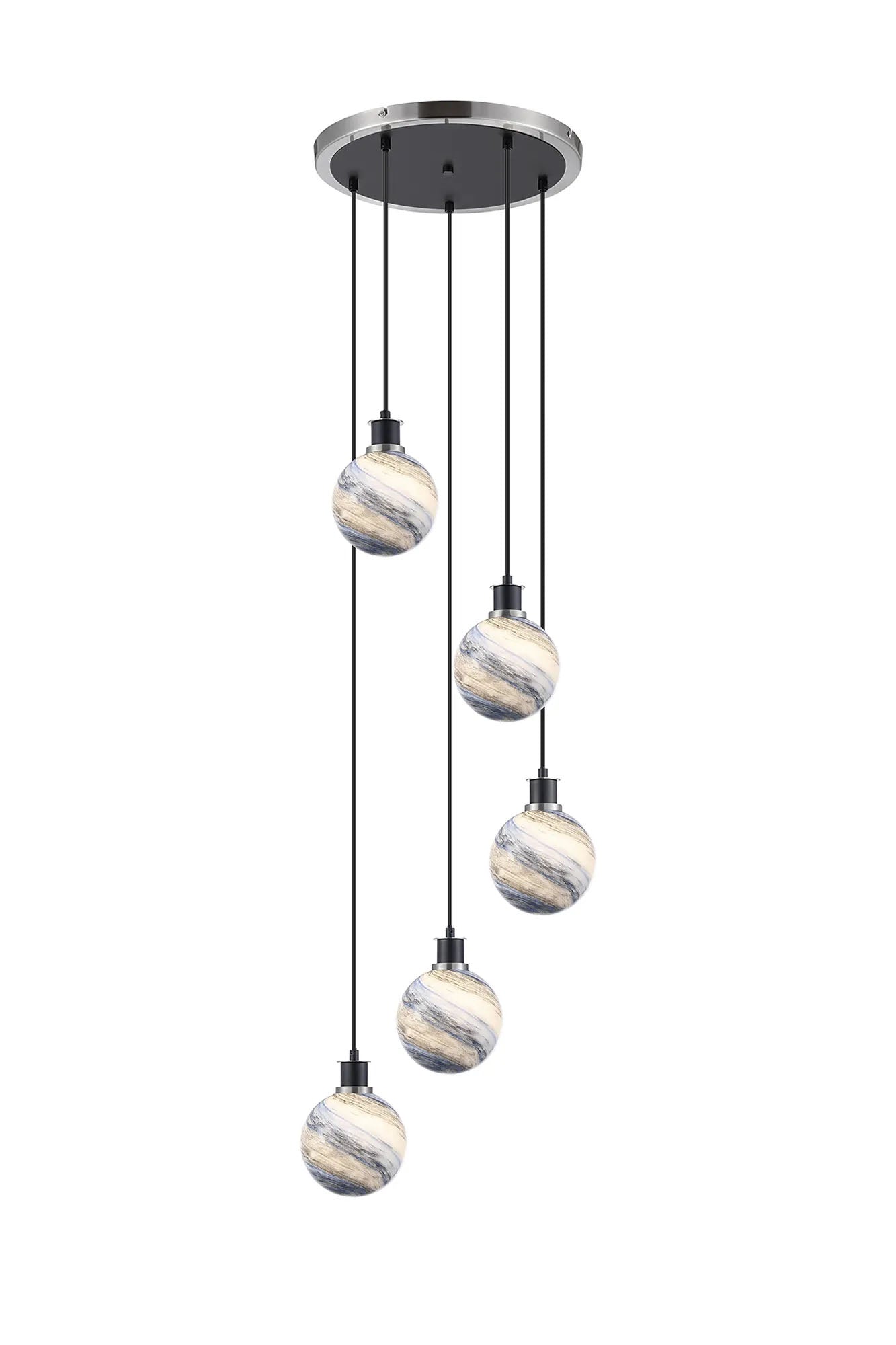 Stevens 48cm Round Pendant, 5 Light E14 With 15cm Round Dark Blue Marble Effect Glass Shade, Satin Nickel & Satin Black Framework