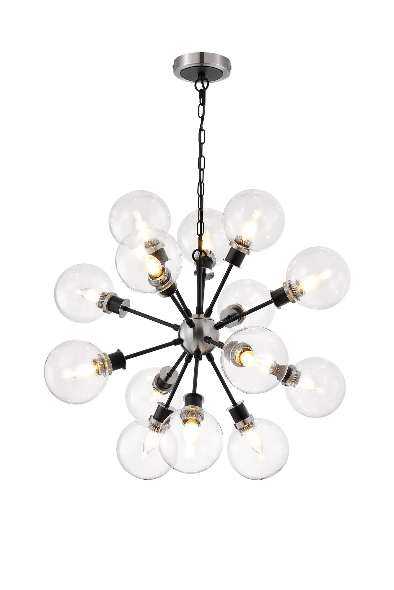 Stevens Pendant, 14 x E14 With 15cm Round Glass Shade, Satin Nickel, Clear & Satin Black