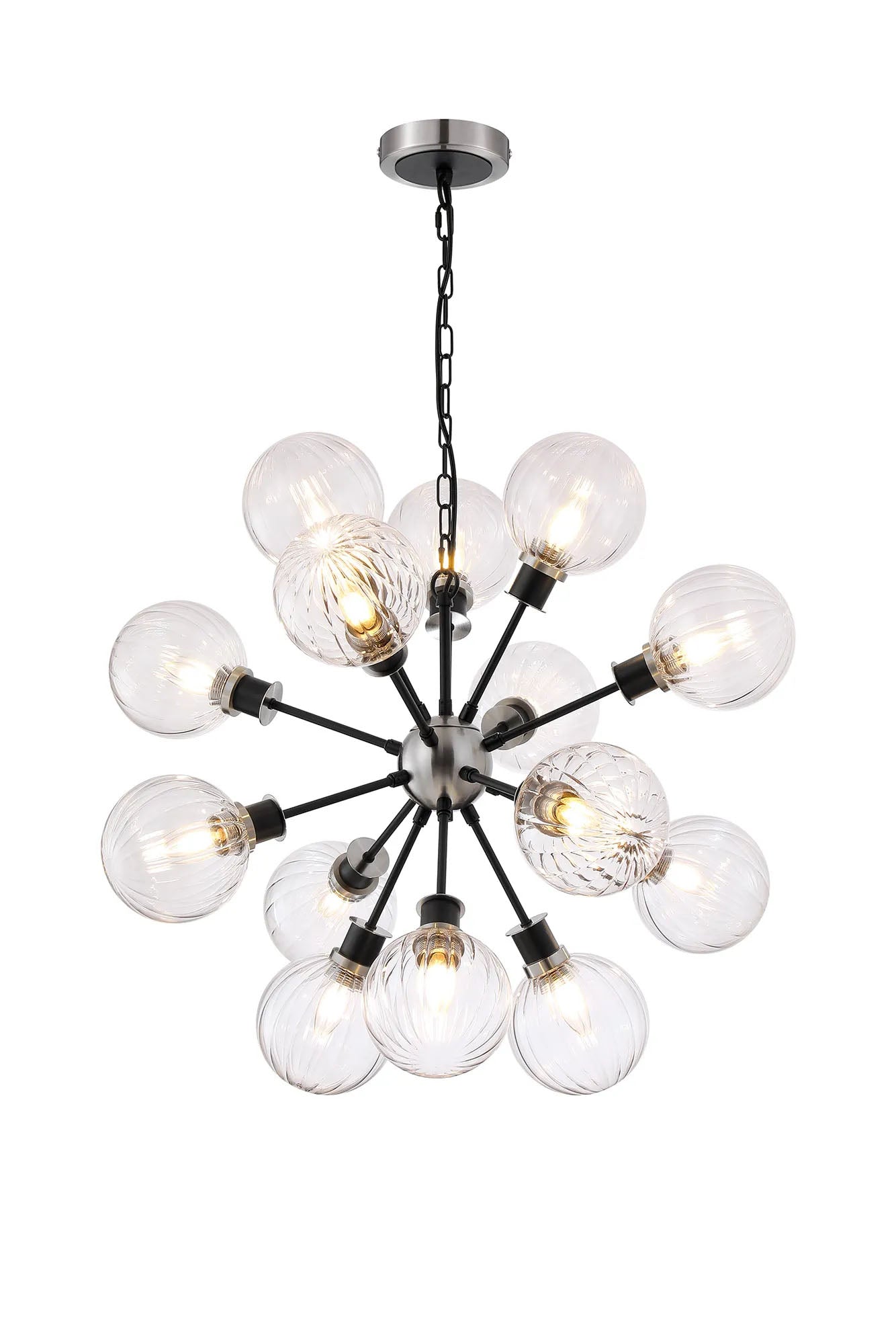 Stevens Pendant, 14 x E14 With 15cm Round Segment Glass Shade, Satin Nickel, Clear & Satin Black
