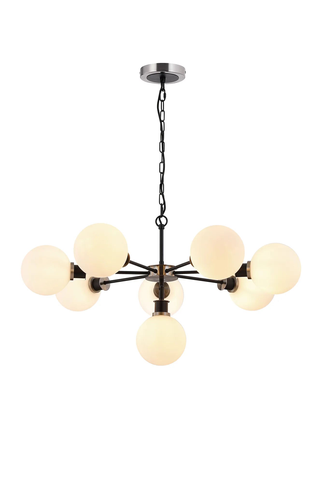 Stevens Pendant, 8 x E14 With 15cm Round Glass Shade, Satin Nickel, Opal & Satin Black