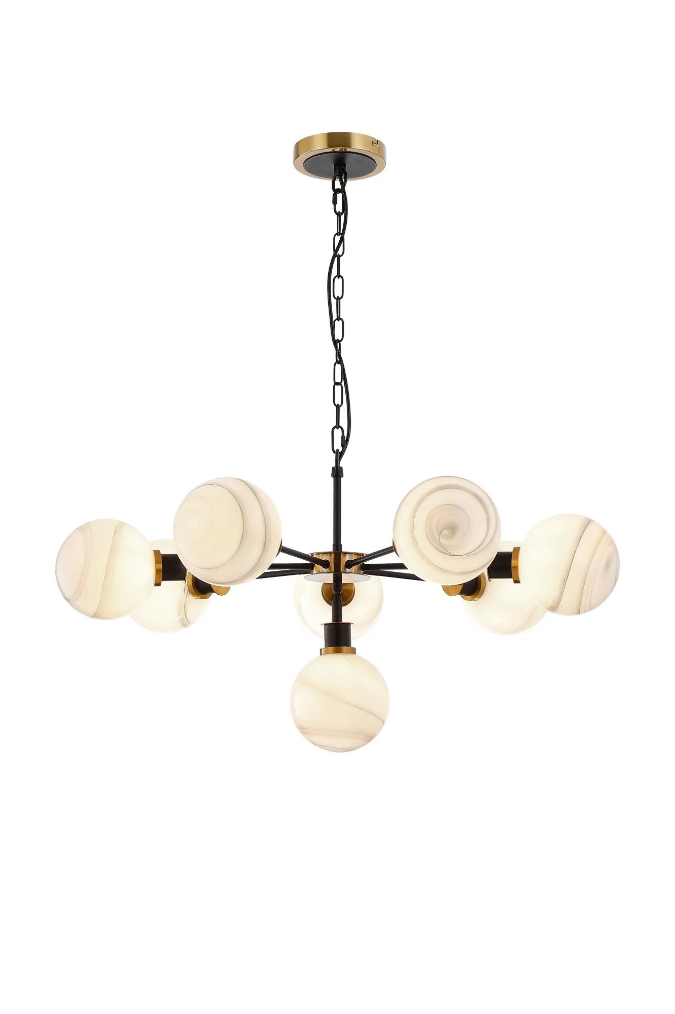 Stevens Pendant, 8 x E14 With 15cm Round Marble Effect Glass Shade, Brass, White & Satin Black